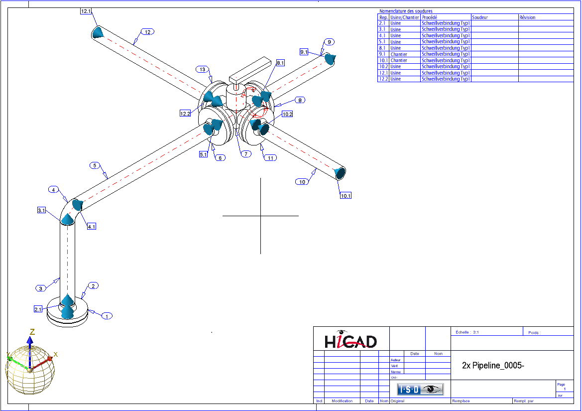 Exemple :(1) Type d'assemblage : soudé au manchon, (2) Symbole de l'élément, (3) Lieu de fabrication : chantier