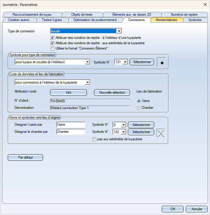 Vous déterminez ici quelles désignations doivent être utilisées pour les lieux de fabrication usine ou chantier lors de l'édition du texte dans le graphique. En outre, vous pouvez y sélectionner les symboles à utiliser pour les raccords soudés avec lieu de fabrication usine et chantier.
