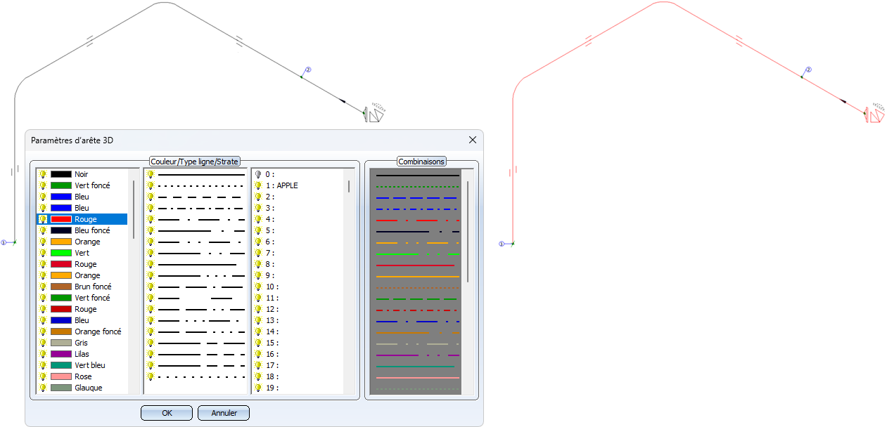 Il arrive parfois que l'on s'aperçoive plus tard que la couleur ou le type de ligne des représentations symboliques doivent être modifiés. En particulier, lors de l'impression, il est souvent nécessaire de faire ressortir la tuyauterie des autres éléments du dessin, tels que les cotations. Cela est possible en une seule étape grâce à la fonction Modifier la couleur du symbole de l’élément de tuyau. Pour ce faire, la fenêtre Paramètres d'arête 3D s'ouvre après l'exécution de la fonction. Immédiatement après avoir sélectionné les paramètres souhaités, ceux-ci changent dans l'isométrie.