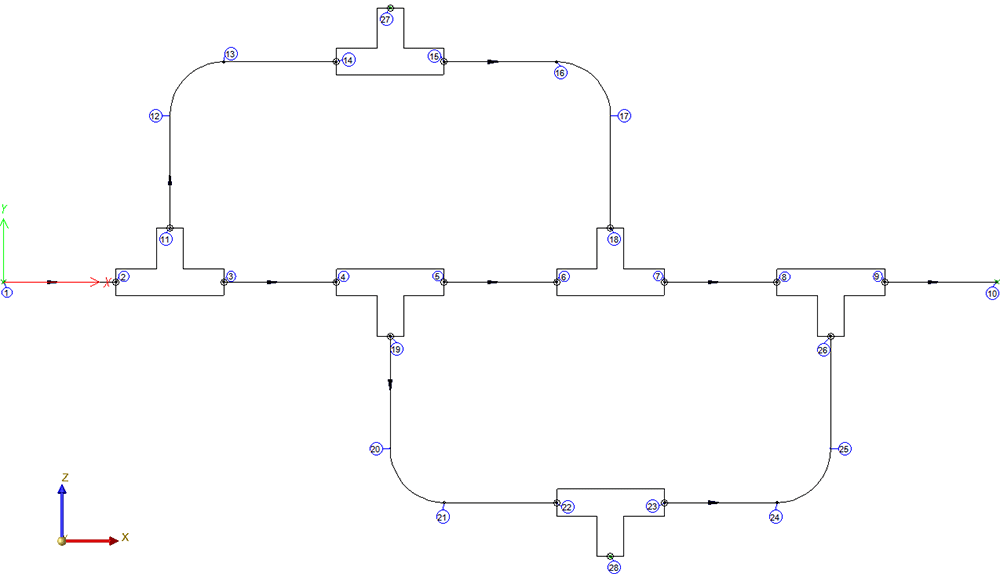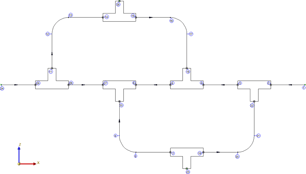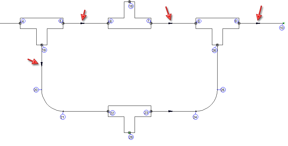 Dans l'isométrie illustrée ici, les quatre flèches du sens d'écoulement mises en évidence ont été inversées à l'aide de la fonction Inverser le sens d'écoulement.
