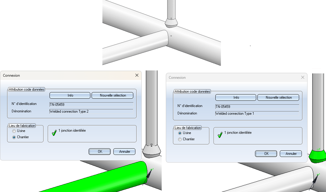 A côté de la zone Lieu de fabrication, il est indiqué si 1 ou 2 jonctions se trouvent au point identifié. S'il y a deux jonctions, le système vérifie si leurs données sont compatibles.