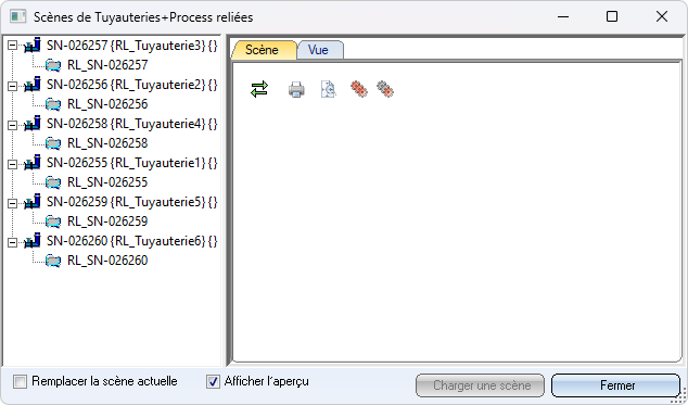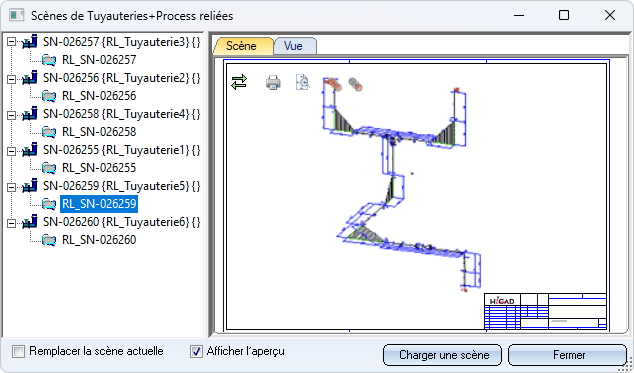 Pour charger un document d'isométrie/de schéma de tuyauterie en vue de le modifier, sélectionnez le document dans la liste de gauche et cliquez sur Charger la scène. Par défaut, le document est chargé dans une nouvelle fenêtre de scène, de sorte que la Planification d'implantation reste également ouverte. Si vous ne le souhaitez pas, cochez la case Remplacer la scène actuelle.