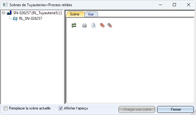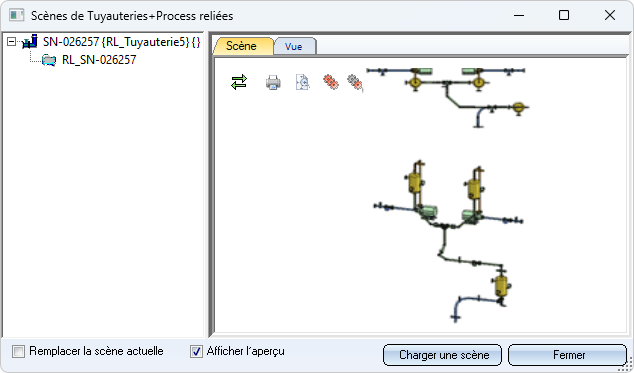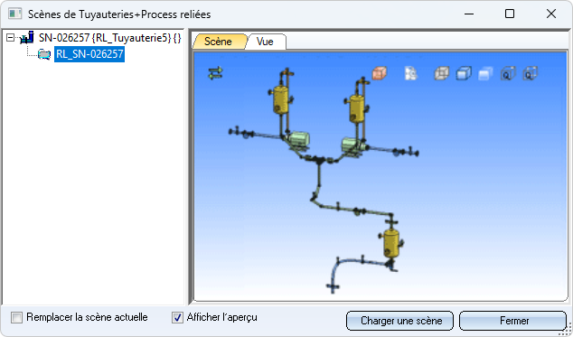 Pour charger une planification d'implantation en vue de la modifier, cliquez sur Charger la scène. Par défaut, la planification d'implantation est chargée dans une nouvelle fenêtre de scène, de sorte que l'isométrie de la tuyauterie ou le schéma de la tuyauterie reste également ouverte. Si vous ne le souhaitez pas, cochez la case Remplacer la scène actuelle.