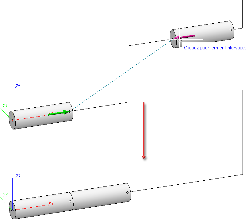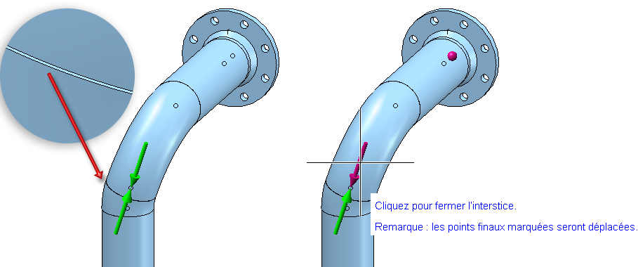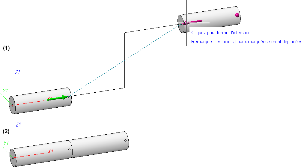 - Si la première solution n'est pas possible, HiCAD tente alors de combler l'interstice en modifiant la position des points finaux.