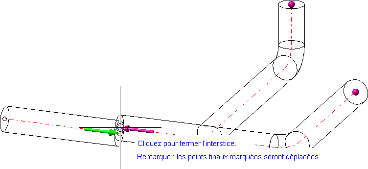 Dans l'exemple ci-dessus, l'interstice ne doit être fermé que si le point final marqué est déplacé.La raison en est que la tuyauterie ne comporte pas de segments droits qui pourraient être prolongés et qui sont tracés dans la direction de l'interstice.