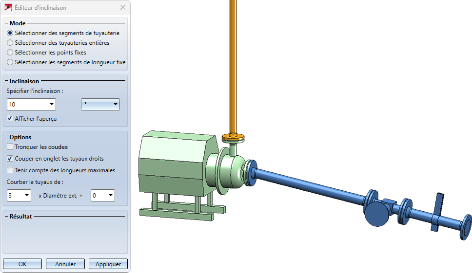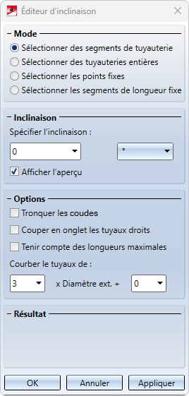 Vous y trouverez également la case à cocher Afficher l'aperçu. Si celle-ci est cochée, la prévisualisation du tracé attendu de la tuyauterie sera actualisée en cas de modification de la sélection ou de l'inclinaison. Cette case à cocher est également importante pour l'encart Résultat.
