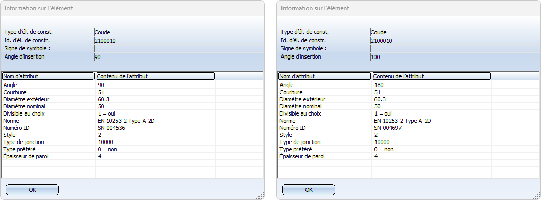 Là où la situation de gauche permet d'utiliser un coude de 90°, il devient nécessaire à droite de commander et de découper un coude de 180°, par exemple. Dans ce cas, l'article attribué à l'élément est modifié :