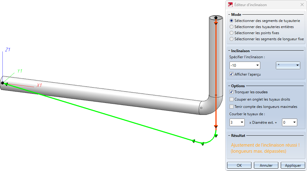 Cette case détermine s'il faut autoriser le dépassement des longueurs maximales. Dans l'exemple suivant, l'assignation de l'inclinaison allonge le tuyau vertical, dépassant sa longueur maximale. Le message correspondant s'affiche dans la zone Résultat et le tuyau sur-allongé est mis en évidence en couleur.