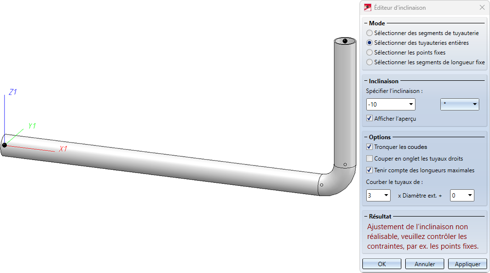 Une erreur est déjà survenue lors de l'initialisation du calcul. Il se peut que les paramètres sous "Courber le tuyau de" (cf. ci-dessous) ne soient pas appropriés. Il se peut également que la structure d'élément elle-même soit erronée. - Ajustement de l'inclinaison réussi ! (longueurs max. dépassées)
