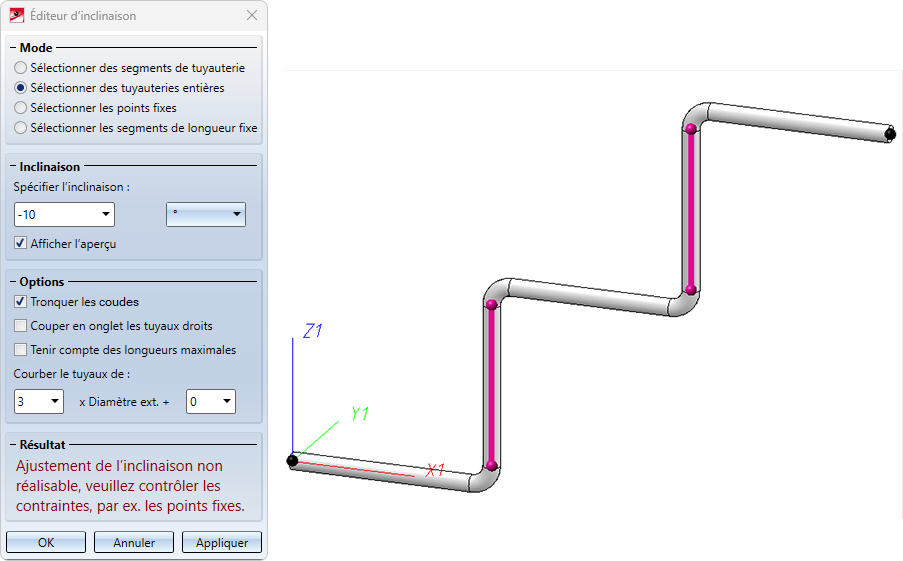 Si la case Afficher l'aperçu est cochée, une prévisualisation du tracé de la tuyauterie est calculée. Selon les paramètres sélectionnés dans la fenêtre de dialogue, il se peut qu'il n'existe pas de solution pour l'assignation de l'inclinaison. Cependant, si une solution existe, le message