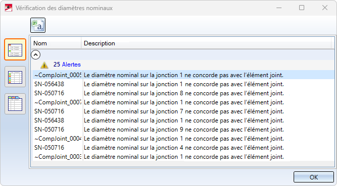 Si des erreurs sont trouvées, une liste des éléments dont les jonctions présentent des diamètres nominaux différents s'affiche, par exemple :