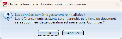 - Les références à la tuyauterie sont automatiquement annulées après l'avertissement et les fiches HELiOS correspondantes sont supprimées.