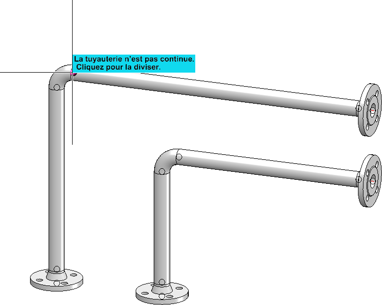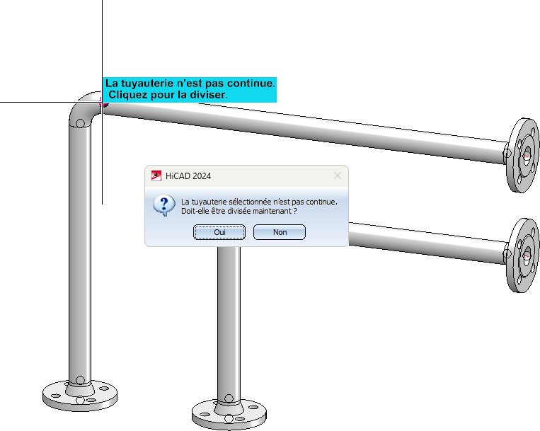 Si la tuyauterie doit être divisée, il suffit de cliquer sur la tuyauterie avec le bouton gauche de la souris et de répondre par Oui à la question qui suit.