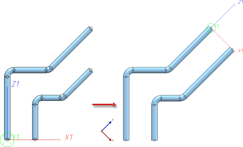 Toutefois, en passant dans un système de coordonnées approprié, par exemple avec la fonction Tuyauteries+Process > Paramètres > Param. > Placer sur jonction