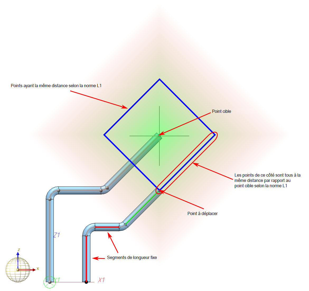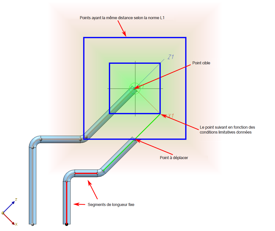 Lors de la modification du tracé, la distance minimale est calculée conformément à la norme L1. Cela a pour effet de privilégier les directions parallèles aux axes de coordonnées à partir du point cible, si le point cible lui-même n'est pas accessible. Le système de coordonnées local est également pris en compte dans ce calcul.