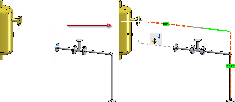 Dans la pratique, on voudra souvent choisir comme point cible un point déjà existant sur la scène, par exemple le point de jonction d'une autre tuyauterie ou le manchon d'un réservoir. De tels points de jonction sont mis en évidence comme points cibles possibles lorsque le curseur s'approche de la tuyauterie ou du réservoir cible.