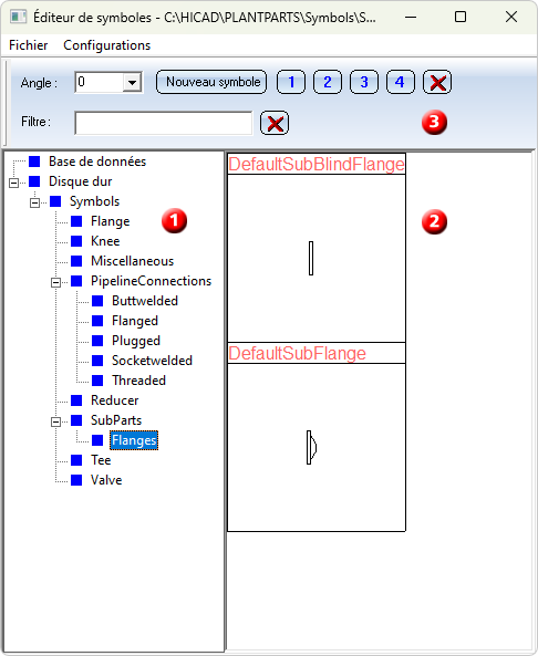 Dans la fenêtre de dialogue qui s'affiche ensuite, tous les éléments gérés par HELiOS sont affichés dans l'arborescence des fichiers sous l'entrée Base de données (indépendamment du fait qu'ils se trouvent ou non dans le serveur HELiOS Vault). Il y a également une entrée pour le répertoire PlantParts\Symbols sur le disque dur. Le Gestionnaire de Configuration (ISDConfigEditor.exe) permet de définir quels répertoires (sous le répertoire PlantParts) sont affichés sur le disque dur (...> ANLAGENBAU > SYMBOLEDITOR >Unterverzeichnisse für Symbole). Le répertoire PlantParts\Symbols est le seul répertoire fourni par défaut lors de l'installation de HiCAD.