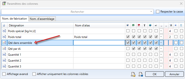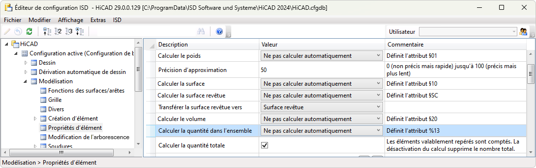 Cette valeur est attribuée à l'attribut Quantité totale (%06) et est automatiquement actualisée au moment de modifier les éléments, par exemple si vous supprimez ou répétez des éléments. Dans les très grandes conceptions, cette actualisation peut avoir un effet négatif sur la performance du logiciel, par exemple lors de la suppression d'ensembles. Dans ce cas, la case à cocher peut être désactivée. Après avoir redémarré HiCAD, la prochaine fois que le dessin sera chargé, l'attribut Quantité totale des éléments concernés sera supprimé au lieu d'être calculé.