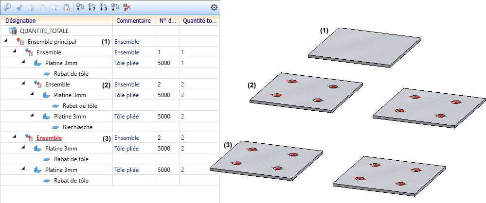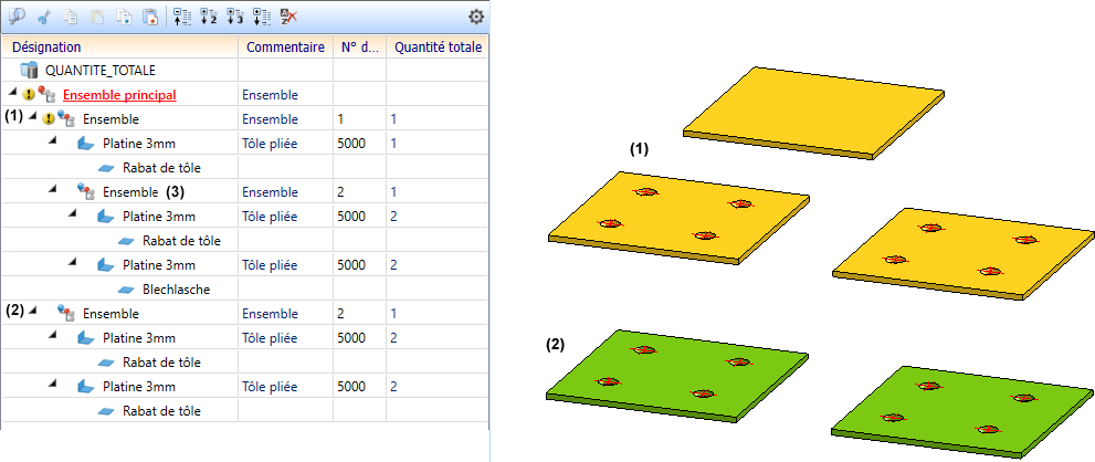 Observons au contraire la scène suivante qui se compose des deux ensembles (1) et (2). Une copie (3) de l'ensemble (2) est subordonnée à l'ensemble (1). Si un repérage par ensemble est effectué ici, les ensembles (2) et (3) obtiendront alors le même numéro de repère, mais puisque les deux ensembles ne se trouvent pas au même niveau de hiérarchie, la quantité totale sera alors de 1.