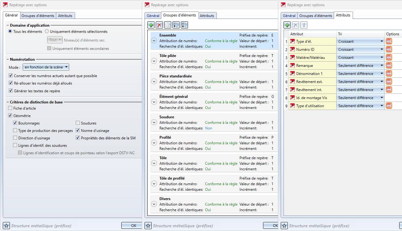 , il est possible, à partir de SP1, de définir un préfixe de repère pour chaque groupe d'éléments, à condition que la génération de textes de repère soit activée dans l'onglet Général. Un élément est alors identifié de manière univoque uniquement par le préfixe de repère + le numéro de repère. Les éléments ne sont pas uniquement différenciés par le numéro de repère sous forme de nombre, mais le préfixe de repère est également pris en compte lors du repérage. Ainsi, un ensemble et un profilé peuvent avoir le même numéro de repère, mais avoir des préfixes différents.