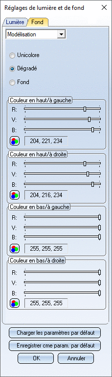Vous spécifiez ici l'apparence du fond de l'écran - une couleur, un dégradé ou un fichier BMP - séparément pour la zone des feuilles et la zone de la modélisation. - Lumière