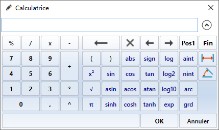 La calculatrice virtuelle s'affiche automatiquement dans le cadre de certaines fonctions, par exemple pour la rotation des éléments 3D. Elle peut être activée également à tout moment au moyen du menu contextuel d'un champ de saisie de valeur.