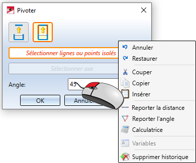 Pour de nombreuses fonctions, la saisie d'une valeur s'effectue directement dans la fenêtre de dialogue des fonctions elles-mêmes. Vous pouvez alors, en activant la liste de choix, sélectionner une valeur utilisée précédemment ou, par un clic droit dans le champ de saisie, ouvrir un menu contextuel pour disposer d'autres fonctions. Par exemple, il est possible de couper ou de copier une valeur dans le presse-papier, d'insérer une valeur du presse-papier, d'annuler la saisie ou encore de saisir la distance ou l'angle à partir de la scène ou de supprimer l'historique. Par ailleurs, vous pouvez utiliser la calculatrice virtuelle pour saisir des valeurs ou l'éditeur de formules pour saisir/modifier les formules les plus complexes.