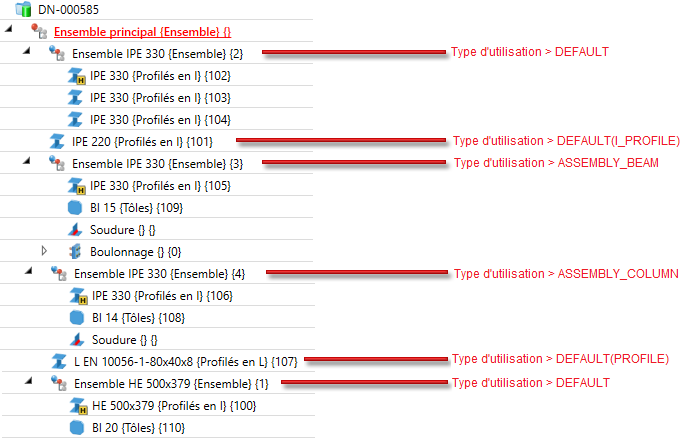 - Pour les ensembles auxquels un type d'utilisation a été attribué, ce seront les paramètres pour chaque type d'utilisation sous ....> Dépendant du type d'utilisation qui seront utilisés, par exemple pour les Assemblage en poutre, il s'agira des paramètres sous ...> Dépendant du type d'utilisation > ASSEMBLY_BEAM.
