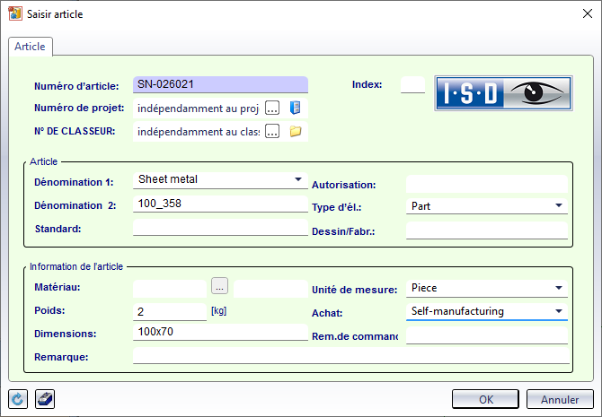 - Par un clic droit sur l'élément principal de tôle dans l'ICN > HELiOS, finalisez manuellement l'attribution aux données de fiche d'article au moyen de la fonction Nouvelle fiche d'article + attribuer