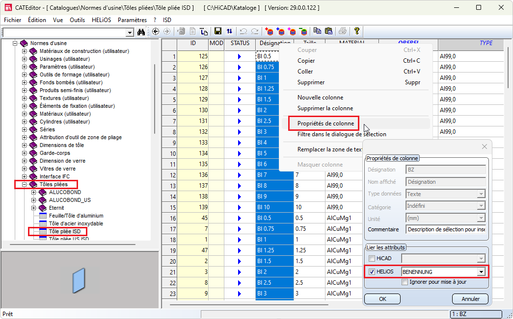 du répertoire EXE de HiCAD. Le catalogue doit être connecté à HELiOS (HELiOS > Connexion). - Ouvrez le tableau Normes d'usine > Tôles pliées > Tôle pliée ISD et effectuez un clic droit sur l'en-tête de la colonne Désignation.