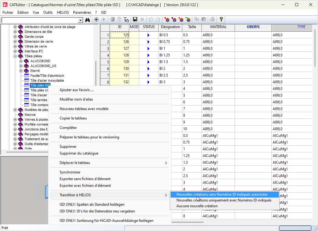 . - Par un clic droit sur le nom du tableau Tôle pliée ISD, sélectionnez la fonction Transférer à HELiOS.