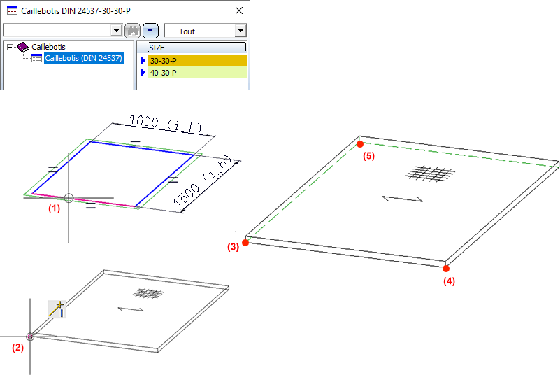 - Nouvelle origine : coin inférieur gauche (3) de la surface de base du caillebotis,