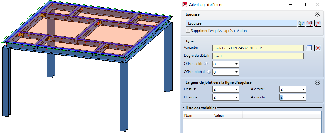 - La variante Caillebotis est maintenant disponible dans le tableau ISD Example et peut être utilisée pour le calepinage d'élément, par exemple sur une esquisse dessinée.