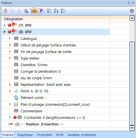 connexion[2]au lieu deconnexion[1]. Par conséquent, la formule pour le plan d'usinage est maintenantconnexion[2].connect_coor, en conséquence, et la formule pour la contrainte doit êtrelength(connexion)>=2, respectivement, pour garantir que ce perçage ne sera appliqué que s'il y a au moins deux perçages. Le premier perçage reste inchangé.