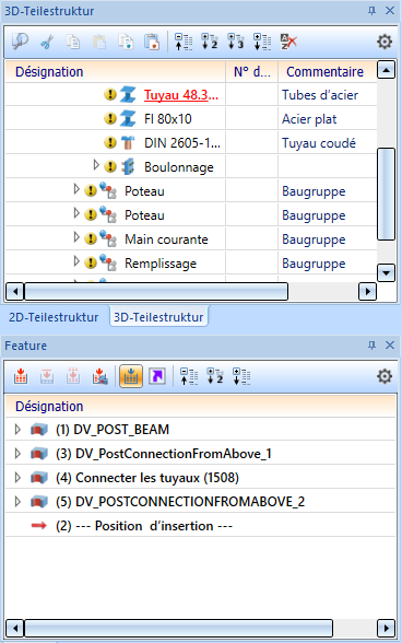En exécutant cette fois-ci une deuxième fois la fonction Résoudre la variante sur l'entrée de Feature de l'élément correspondant (ici l'élément Rambarde le long des profilés (résolu)), il devient possible « de révéler » les Features à partir desquels cette variante de rambarde a été créée. Après la résolution, l'entrée du Tube en acier devrait ressembler à ceci :