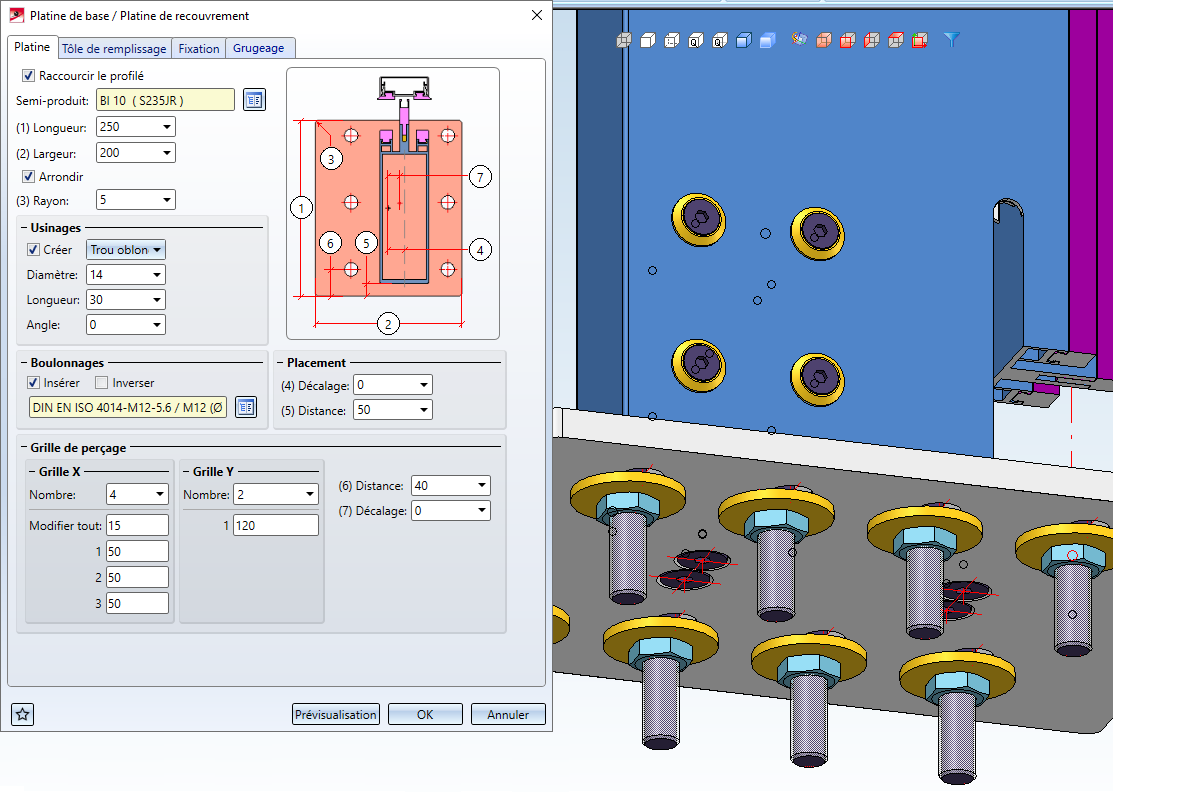 Cela fait, la fenêtre de dialogue Platine de base / Platine de recouvrement s'ouvre pour configurer la variante dans les onglets Platine, Tôle de remplissage, Fixation et Grugeage.