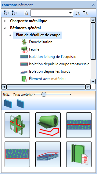 Dans Fenêtre d'ancrage Fonctions bâtiment > Bâtiment, général > Plan de détail et de coupe se trouvent les fonctions suivantes :