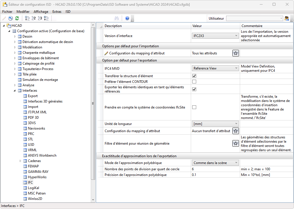 Vous définissez quels attributs IFC sont affectés à quels attributs HiCAD dans le Gestionnaire de Configuration sous Interfaces > IFC via le paramètre de Configuration du mapping des attributs. Ce paramètre est disponible à la fois pour l'importation et l'exportation.