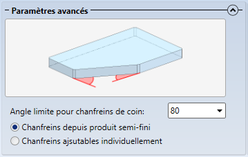 Vous pouvez ici encore spécifier sur les Chanfreins depuis produit semi-fini devront être utilisés ou si vous souhaitez paramétrer les Chanfreins ajustables individuellement.