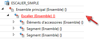 Pour les escaliers, un ensemble est créé et comporte le numéro ID Escalier. Cet ensemble est sous-divisé en deux types d'ensembles : Accessoires et Segments. L'ensemble des éléments accessoires comporte tous les boulonnages. L'ensemble des segments, quant à lui, contient les profilés et tôles (soudures inclues) pour le limon, les marches et les paliers. Pour les escaliers avec un palier intermédiaire, il existe deux ensembles avec le nom Segment. L'un fait référence aux composants pour l'entrée jusqu'au palier intermédiaire (inclus), le second correspond aux composants jusqu'à la sortie.