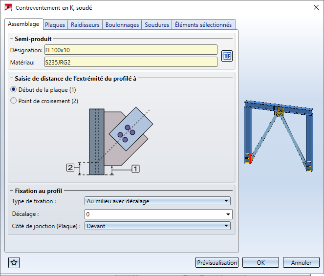 Après l'identification des profilés, la fenêtre de dialogue Contreventement en K, soudé ou Contreventement en K, vissé s'ouvre. La différence entre les fenêtres consiste aux options supplémentaires pour les contreventements en K vissé disponibles pour les plaques de montage. Hors cela, le fonctionnement des deux fenêtres de dialogue est le même.