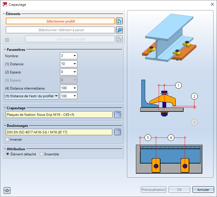 puis procédez à la composition des éléments du boulonnage. Ce paramètre est identique à la fonction Boulonnage de la Structure métallique. Si la direction du boulonnage doit être inversée, cochez alors la case Inverser.