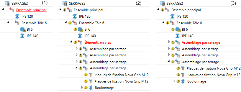 (1) Arborescence d'origine, (2) Macro exécutée avec l'option Élément détaché, (3) Macro exécutée avec l'option Ensemble