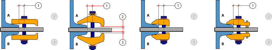 De gauche à droite : DIN 3568, MTH-Nova-Grip, Lindapter Type A/B, Lindapter Type D2