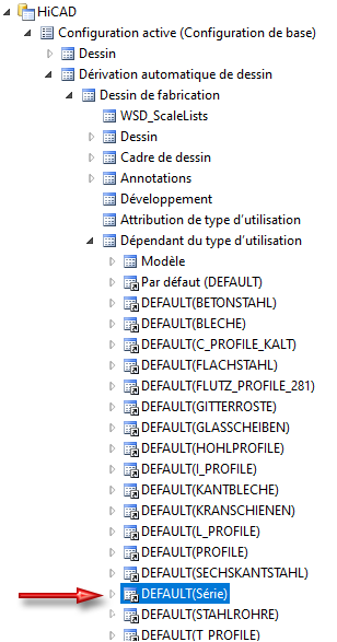 Pour les profilés de série qui sont basés sur des coupes transversales 2D de série, l'attribution d'un type d'utilisation n'est cependant pas possible, mais il est quand même possible de créer et d'utiliser également pour les profilés de série ses propres configurations pour la dérivation de dessin. Cela est rendu possible par la définition d'un type d'élément en conséquence et d'une attribution de type d'utilisation correspondante dans le Gestionnaire de Configuration.