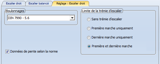 Vous choisissez dans l'onglet Réglages : Escalier droit le type de boulonnage et la classe de résistance des vis nécessaires pour fixer les marches aux limons. Vous y définissez également le type de limite de la trémie de l'escalier.