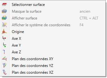 En passant par le menu contextuel, la contrainte de distance peut être établie entre l'élément géométrique sélectionné et les éléments suivants du système de coordonnées :