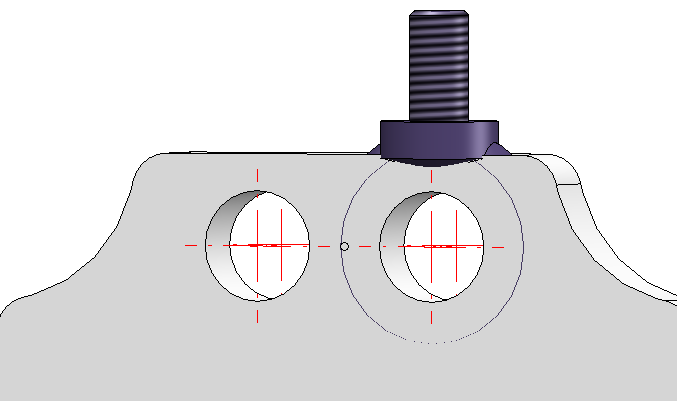 Le tore du boulon à œil doit être ajusté en tangence par rapport à la plaque. Si, lors de la génération d'une contrainte de tangence, vous cliquez sur l'élément faisant partie du boulon à œil représenté devant dans la vue ci-dessus, alors cet élément sera tangentiel par rapport à la plaque. De ce fait, la vis sera positionnée derrière la plaque :