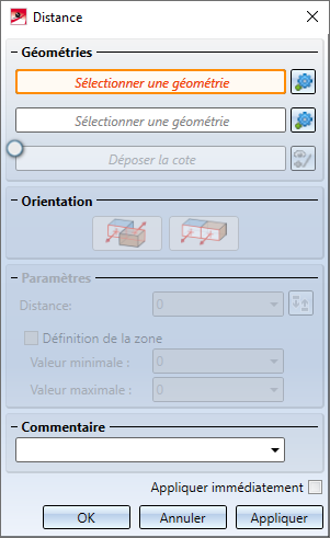 - Appliquer immédiatement: si cette case est cochée, les contraintes seront (si possibles) aussitôt appliquées. Exemple : une contrainte de distance est générée juste après l'identification de deux géométries avec la distance actuelle.