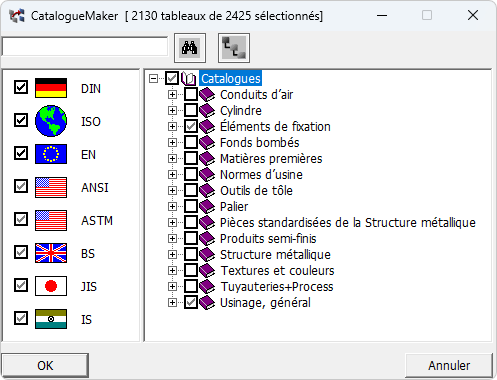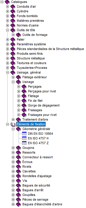 - Sur la droite, dans l'arborescence, désactivez tous les catalogues à l'exception Usinage, général et Éléments de fixation.